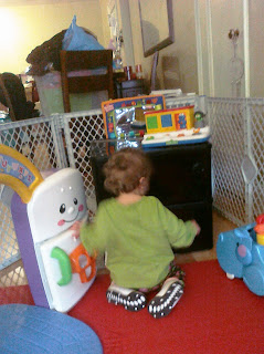 We need to redesign her play area. Problems are: there are no steps or different heights that she can climb on, none of her toys are tall enough that she is motivated to stand and play, and she has too many toys available, so it's hard to get her to focus on anything. Today I came up with some crafty solutions!