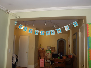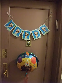 Daddy left early in the morning to get balloons filled, while mom got some snacks ready and decorated (with the invitations that came with the party supplies. Since I never sent them out I got crafty with them.). The Shuffs arrived first and we all went out to lunch together. Then we returned home, just in time for Grandma & Grandpa to arrive. Maya napped and Grandma Lainey & Grandpa Joe came with more presents! We played on the floor, opened presents, and ate cake (A doggy cake made by me, and a strawberry shortcake that Dave's parents brought up from the city because it's the best cake ever!). Here are pics: