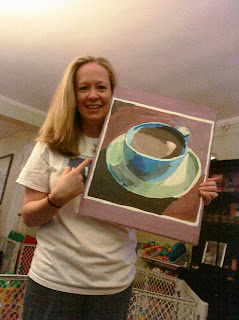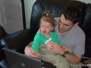 Carol (her therapist) and I watched and waited to see what would happen . . . and she managed to get down (she puts her hands down onto a little stool that was next to her, then bent her legs down). And over the course of the day she stood a bunch more times. Dave didn't get home until late, so we taped it so that he could see: