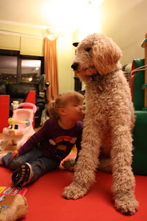 1. Maya &Parker are BFFs. He likes to try to engage her in playing, which is adorable. When I unrolled the tunnel for Maya the other day, they immediately fell into playing this game: Maya crawls through the tunnel, Parker walks along the outside. When Maya passes by a window he would poke his nose with it, which makes her giggle wildly. Then when she emerges, he gives her a thorough sniffing to make sure nothing strange happened in the tunnel: