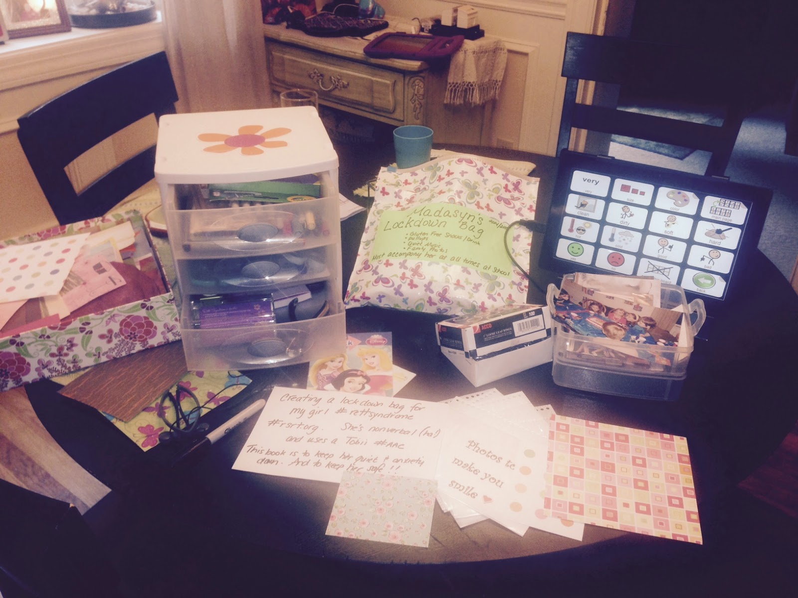 The makings of a lockdown bag, to help a girl with Rett Syndrome keep her anxiety down when the school is in lockdown mode, with Tobii eyegaze in the background.