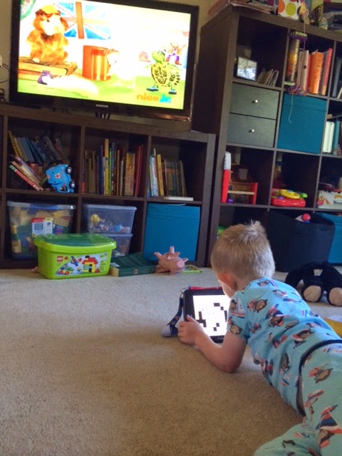 and multitasking-telling Mommy about the characters on TV and drinking juice at the same time!
