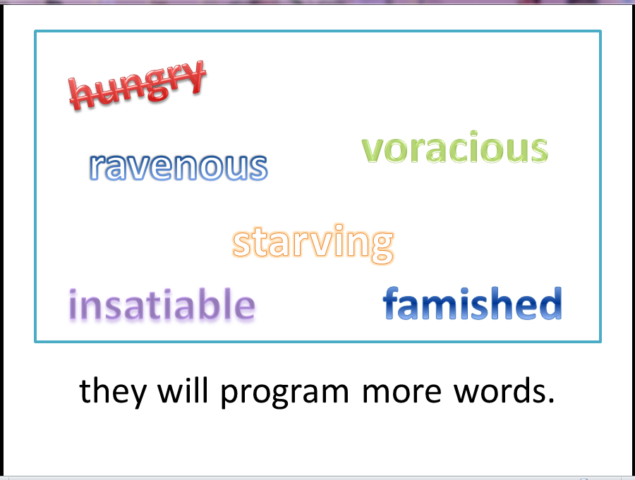 Anonymous, don't feel badly. If you show an elephant to a five year old and ask them to describe it, "big" is probably going to be a more common response than "enormous." I would (and do) just keep modeling synonyms so that the saucy exciting words are getting used, and eventually the user will pick them, too.
