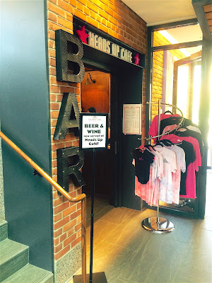 image shows the entrance to the coffee and wine/beer bar, with small sign outside reading that "Beer & Wine are now served at Heads Up Cafe". The wall is exposed brick, and there is a spiral rack displaying t-shirts for sale outside of the entrance.