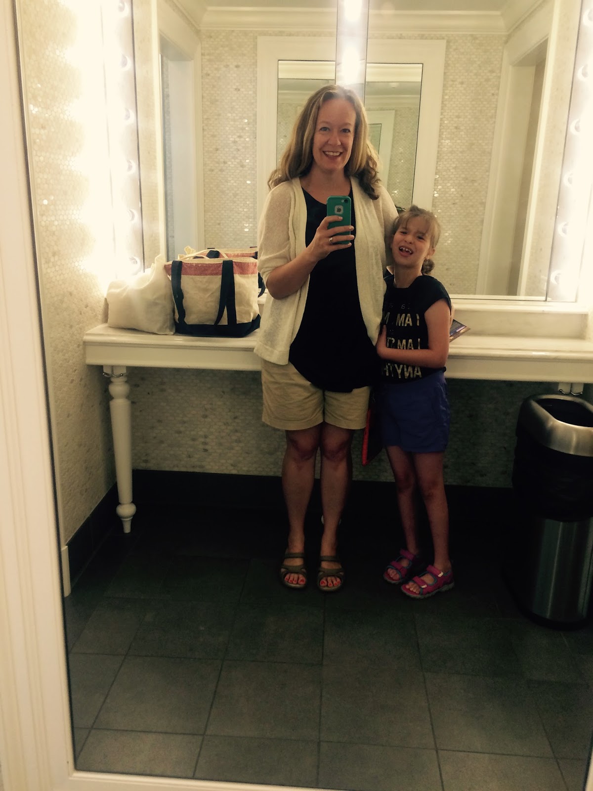 images shows Maya and I standing before a full length mirror, with white sparkly walls and dressing-room-style light bulbs lining the mirror