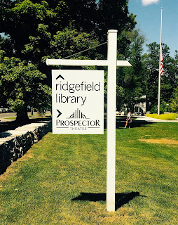 image is a white wooden sign which reads "ridgefield library (forward arrow)Prospector Theater (right arrow)" posted in green grass