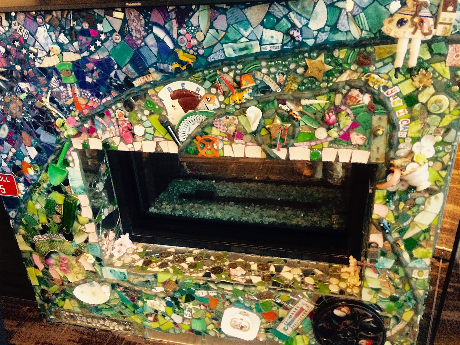 image is of a brightly colored (blues and greens, mostly) mosaic that is the size and shape of a fireplace