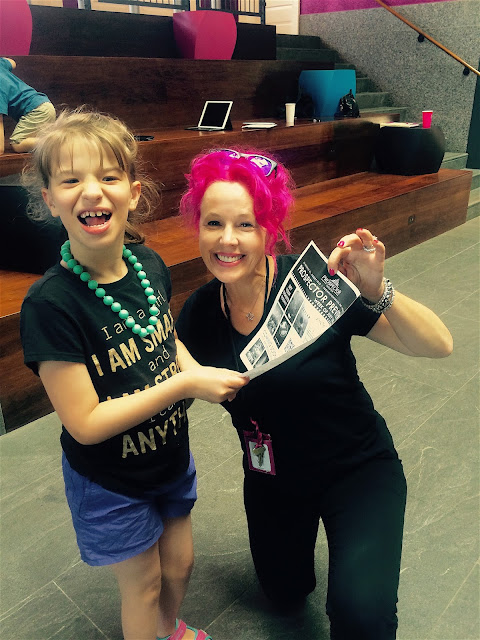 Facebook page and because she has fluorescent pink hair. We were half out the door (literally, Dave and Will were already walking to the car) when I turned back to say hi to her and compliment the great work and mission of the theater.