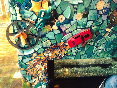 image is a close-up of another section of the mosaic, featuring a bright pink matchbox-style car