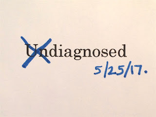 (Image is the typed word "Undiagnosed", a blue marker has crossed out the "Un" and added a the date of our official diagnosis underneath, 5/25/17.)