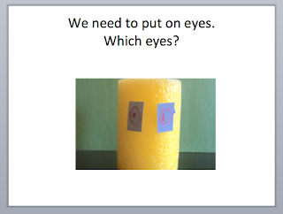 -construction paper and/or googly eyes (eyes, nose mouth----we'll use construction paper to add in extra language choices about which color to use, whether we want big or small eyes, etc)