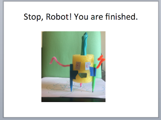 I made a book to go with this activity. It's very simple and filled with opportunities to model core words for beginning AAC users (need, make, put, on, which, look, take, off, in, turn, it, go, stop, finished). I also plan on turning the robot on/off and modeling: my turn, your turn, on, off, go, stop, more, finished. Body parts (eyes/nose/mouth/arms/legs/body), colors (of markers and construction paper), and size descriptors (big/small) will also be used when we are making choices and assembling.
