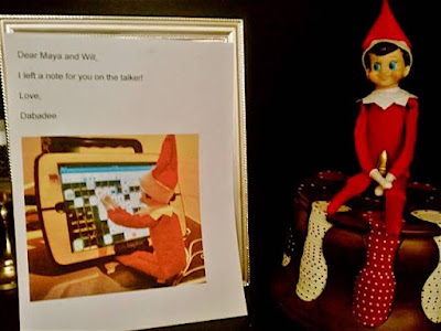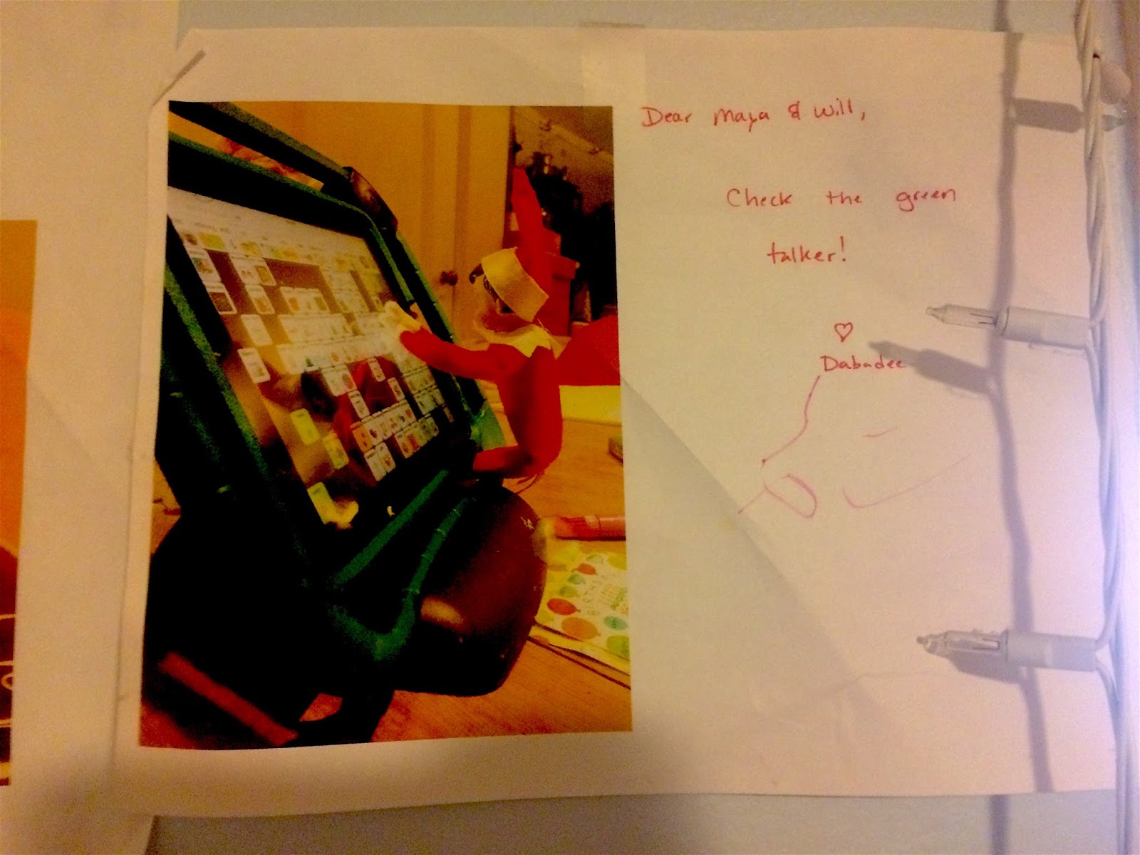 Dabadee (our elf) left a picture of himself using the talker, and a note that said "I left a note for you on the talker!" The note left on the talker read, Only 11 days until Christmas!