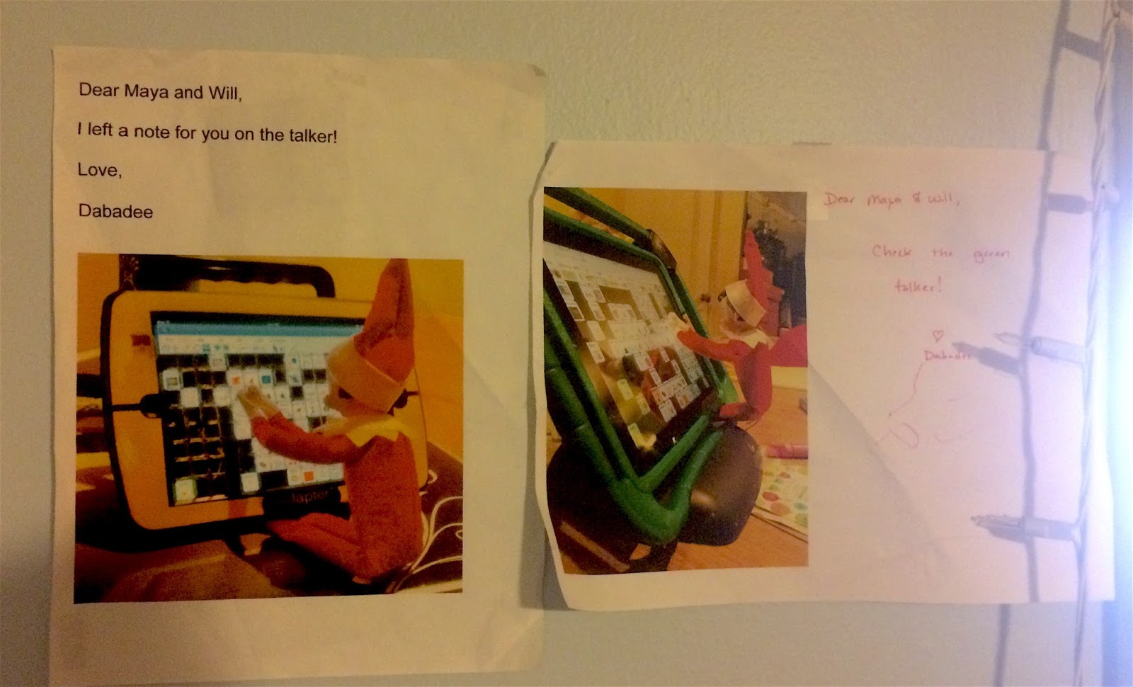 2. Send the picture to me in any of the following ways (whatever's easiest-no need to do all!). Also, if you'd like, share some information about your location, child, AAC system, and elf (totally optional). I'll put up whatever you send. For example, "Dabadee the elf came last night and left a note on Maya's talker! It said 'Today would be a great day for some hot chocolate!' We live in New York City and use Speak for Yourself---we didn't know that Dabadee liked to use a talker, too!":