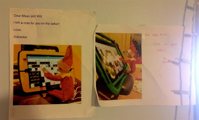 For the past 4 years, our elf has visited one of our talkers, much to the delight of Maya and Will. It's happened once per year----but I have a feeling that this year he may leave a few notes :) Sometimes he even leaves a photo behind that shows him with the talker! Maya has saved these photos on her wall for years (literally).